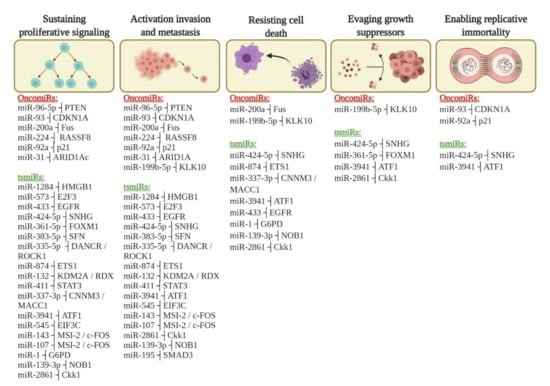 For instance, the expression profiles of 26 cancer-related miRNAs from 57 CC tumor tissue were analyzed. Through prediction target tools, the authors identified the target interaction between DEmiRNAs and target genes. Finally, we associated this interaction of tsmiRs and oncomiRs with hallmarks of cancer (Figure 5), specifically, pathways related to CC progression. The physical interactions between miRNAs and target genes predicted by in silico tools were validated using luciferase assay; these data are summarized in Table 4.
