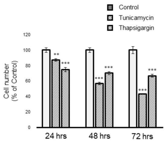 Endoplasmic reticulum (ER)-stress-induced Müller cell death. Cell viability was evaluated based on alamarBlue analysis, following treatment with tunicamycin (0.5 µg/mL) or thapsigargin (1 µM) for up to 72 h. Data are shown as the mean ± SD (n = 4) of four experimental trials. ** and *** Significantly different from untreated cells at each time (p < 0.01 and 0.001, respectively).