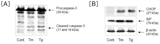 ER-stress-induced Müller apoptotic cell death. MIO-M1 cells were treated with tunicamycin (Tm) (0.5 µg/mL) or thapsigargin (Tg) (1 µM) for up to 72 h. After 72 h treatment, cellular proteins were collected, and then we conducted Western blot analysis for cleaved caspase-3 (A). Cellular proteins were collected after 24 h treatment, and then we conducted Western blot analysis for ER-stress-related proteins BiP and C/EBP homologous protein (CHOP) (B).