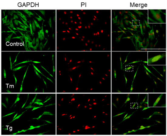 Nuclear translocation of glyceraldehyde 3-phosphate dehydrogenase (GAPDH) in ER-stress-induced Müller cell death. MIO-M1 cells were treated with tunicamycin (Tm) (0.5 µg/mL) or thapsigargin (Tg) (1 µM) for up to 48 h. The representative images of immunofluorescence staining of glyceraldehyde 3-phosphate dehydrogenase (GAPDH; green) and propidium iodide (PI; red) and the merging of GAPDH- and PI-stained images are shown at 48 h after treatment. The magnified illustration of intracellular localization of GAPDH is shown in the top corner of the untreated merged image. Scale bars, 100 µm.