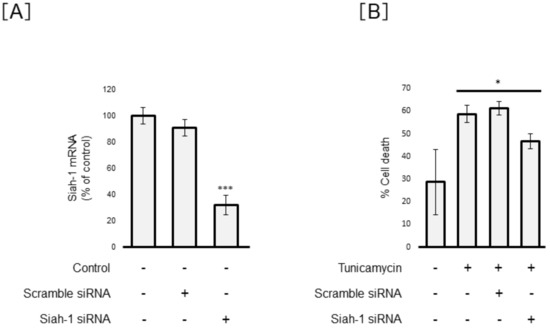 Significant reduction in ER-stress-induced cell death in Siah-1-knockdown Müller cells. MIO-M1 cells were transfected with 25 pmol of scrambled small interfering RNA (siRNA) or Siah-1 siRNA. (A) At 48 h post-transfection, we confirmed Siah-1 mRNA levels using RT-qPCR analysis for evaluating the transfection efficiency. Data are shown as the mean ± SD (n = 4) of four experimental trials. *** Significantly different from un-transfected cells (p < 0.001). (B) We evaluated cell viability using trypan blue. Data are shown as the mean ± SD (n = 4) of four experimental trials. * Significantly different from tunicamycin-treated cells (p < 0.05).