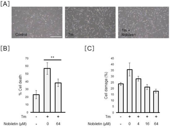 Effect of nobiletin on tunicamycin-induced Müller cell death. MIO-M1 cells were treated with tunicamycin (Tm) (0.5 µg/mL) in the presence or absence of nobiletin (4–64 µM) for 48 h. (A) Morphological images were shown to evaluate cell viability. Scale bars, 400 µm. (B) We evaluated cell viability using trypan blue. Data are shown as the mean ± SD (n = 4) of four experimental trials. ** Significantly different from tunicamycin-treated cells (p < 0.01). (C) We performed lactate dehydrogenase (LDH) analysis to confirm the dose-dependent inhibitory action of nobiletin on Tm-induced cell damage.