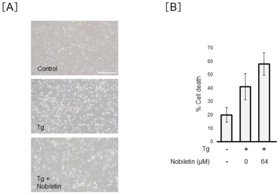 Next, we examined whether nobiletin exerts a protective action against ER-stress-induced Müller cell death. The morphologic images showed the protective action of nobiletin against Tm-induced Müller cell death (Figure 5A). As shown in Figure 5B, cell viability analysis using trypan blue demonstrated that Tm increased Müller cell death by 2.5 ± 0.4-fold and the percentage of cell death induced by Tm significantly diminished from 56.9 ± 7.7% to 38.3 ± 4.9% after co-treatment with Tm and nobiletin (p < 0.01). LDH analysis demonstrated a dose-dependent action of nobiletin on the prevention of Tm-induced Müller cell damage (Figure 5C). In contrast, nobiletin did not inhibit Tg-induced Müller cell death (Figure 6).