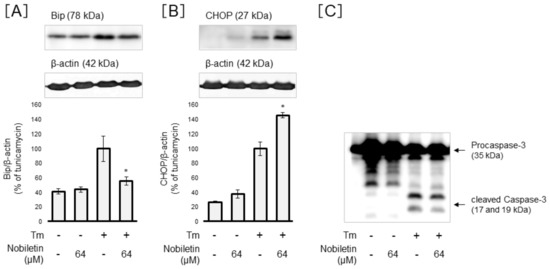 We further investigated the action of nobiletin on ER-stress-related proteins, BiP and CHOP, in Tm-treated Müller cells. Nobiletin was found to significantly attenuate the Tm-elevated BiP expression at a concentration of 64 µM (p < 0.05) (Figure 7A). In contrast, nobiletin significantly augmented the Tm-induced CHOP expression (p < 0.05) (Figure 7B). Western blot analysis also demonstrated that nobiletin suppresses the Tm-induced upregulation of cleaved caspase-3 in Müller cells (Figure 7C).