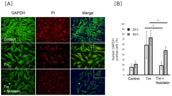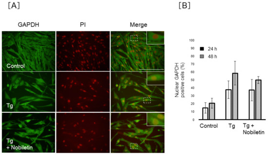 To clarify the regulation of GAPDH nuclear translocation by nobiletin, we investigated the action of nobiletin on GAPDH nuclear accumulation under ER stress conditions. As shown in Figure 8, the percentage of MIO-M1 cells positive for nuclear GAPDH decreased significantly by 18.3 ± 7.4% or 48.0 ± 7.6% in nobiletin–Tm-co-treated cells (p < 0.05) following 24 or 48 h of treatment, respectively, compared to 58.7 ± 26.3% (24 h) or 72.9 ± 15.1% (48 h) in Tm-treated cells. We investigated the action of nobiletin on Siah-1 and GAPDH protein expression in Müller cells, but nobiletin showed no effect on Siah-1 and GAPDH protein expression in Tm-treated MIO-M1 cells (data not shown). In contrast, nobiletin did not show inhibitory action against the Tg-induced nuclear translocation of GAPDH (Figure 9).