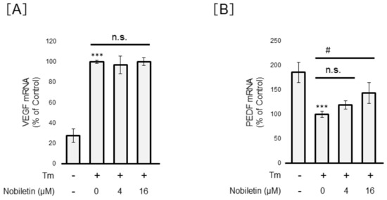 We investigated the action of nobiletin on the expression levels of VEGF and PEDF in Müller cells. As shown in Figure 10, in MIO-M1 cells, Tm was found to significantly increase VEGF mRNA expression but decrease PEDF mRNA expression at 24 h after treatment. Nobiletin showed no action on the Tm-induced VEGF expression level. However, nobiletin significantly augmented PEDF expression in Tm-treated cells (p < 0.05). These results suggested that nobiletin protects BRB integrity through the augmentation of PEDF expression, leading to an improvement in the VEGF/PEDF ratio.