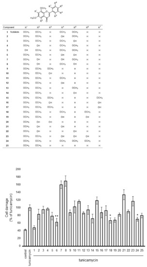 Evaluation of protective action by nobiletin congeners on ER-stress-induced Müller cell death. MIO-M1 cells were treated with tunicamycin (Tm) (0.5 µg/mL) in the presence or absence of the congeners (compounds 2–25) for 48 h. Cell viability was evaluated based on LDH analysis. Data are shown as the mean ± SD (n = 4) of four independent experiments. *and **, Significantly different from untreated cells (p < 0.05 and 0.01, respectively).