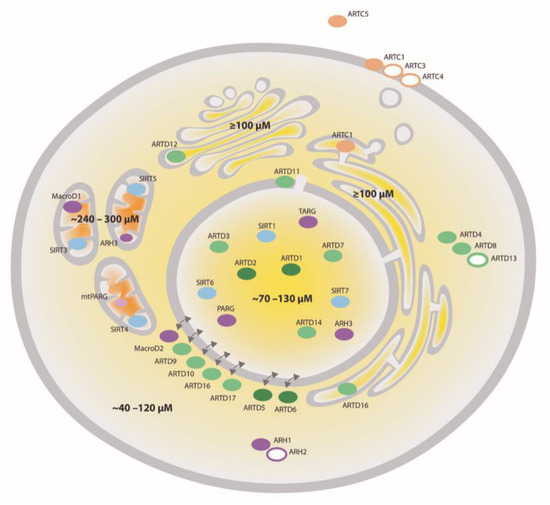 In addition, coexistence of several NAD+-consuming enzymes in the same compartment provides the third, competition-based regulation layer. Based on the low Km of nuclear ARTD1 for NAD+ (described to vary between 20 μM and 50 μM [94,139,140]), it seems to be constitutively active and the main NAD+ consumer in homeostatic conditions [141,142]. Consequently, ARTD1 forces the cell to continuously synthesize NAD+ de novo or via the salvage pathways to maintain cellular viability and allowing other ARTs to be active [143]. Due to this resynthesis of intracellular NAD+, MARylation mediated by other mono-ARTs with high affinity for NAD+ is still possible despite continuous ARTD1-mediated NAD+ consumption.