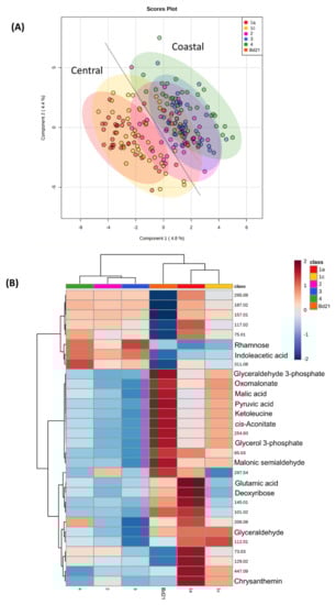 The sources of variation between the regions and subpopulations were targeted by ANOVA (p < 0.05) and some m/z were identified based on database comparisons of the parental ion masses and correlations with predicted ionisation patterns. These major sources of variation are displayed using a heatmap (Figure 1B). The clustering patterns provided clearer evidence of metabolomic separation of the Turkish accessions into coastal (2, 3 and 4) and central (1a, 1c) subpopulations, with Bd21 more closely aligned to the central but having some distinctive characteristics. Examination of the identified metabolites suggested that components of the tricarboxylic acid (TCA) cycle (citrate, malic acid, pyruvate, 2-oxoglutarate, cis-aconitate) were more abundant in the central compared to the coastal accessions.