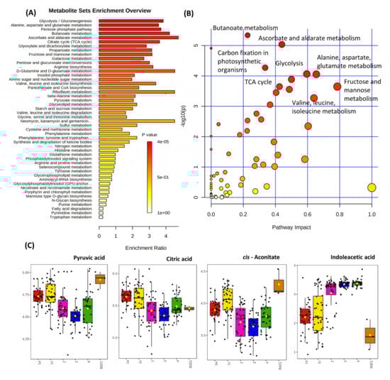 To provide wider functional information, pathway enrichment (Figure 2A) and pathway impact analyses (Figure 2B) were undertaken based on the significant metabolites. The most robust statistical valid results (Holm p and false discovery rates (FDR) (both < 0.05)) were seen for glycolysis/gluconeogenesis, alanine, aspartate and glutamate metabolism, pentose phosphate pathway and butanoate metabolism (Supplementary Materials Table S2). Additional pathways were found to be statistically relevant using mummichog pathway (https://shuzhao-li.github.io/mummichog.org/, accessed on 3 March 2021) assessment including TCA cycle, glyoxylate metabolism or valine, leucine, isoleucine biosynthesis pathways (Supplementary Materials Table S3). To illustrate these changes, some statistically significant exemplar metabolites were extracted from the matrix and presented as box and whisker plots (Figure 2C). The three TCA metabolites showed increases in the accessions from regions 1a and 1c which encompass the central Brachypodium subpopulation (and Bd21) compared to regions 2, 3 and 4, where the coastal subpopulation is located. Whilst most of the significant metabolite differences were seen as increases in the central subpopulation (Figure 1B), auxin, indoleacetic acid (IAA) and rhamnose were elevated in the coastal subpopulation.