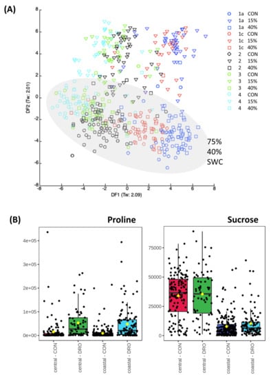The metabolomes of Brachypodium accessions under drought stress and in controls. Eight-week-old Brachypodium accessions were transferred to the National Plant Phenomics Centre, Aberystwyth, UK. The watering was regulated to achieve three different soil water contents (SWC); 15%, 40% and 75% (control, CON). After 12 days of drought, leaves were sampled and the metabolomes were assessed using FIE-HRMS. (A) Discriminant Function Analysis of the derived metabolite profiles. Accessions are classified according of Turkish climate region of origin []: 1a (blue symbols), 1c (red symbols), 2 (black symbols), 3 (green symbols) and 4 (turquoise symbols). The 75% and 50% symbols are highlighted with a grey ellipsis to highlight their similarity but has no mathematical relevance. (B) Metabolomes from control (40%, 75% SWC) and droughted (15% SWC Brachypodium accessions forming the central (region 1a, 1c) and coastal (region 2, 3, 4) subpopulations were assessed for variation. Functionally important metabolites in drought responses; proline and sucrose are shown.