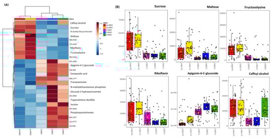 Key variables in the metabolomes of droughted Brachypodium accessions collected from different Turkish regions. Eight-week-old Brachypodium accessions were transferred to the National Plant Phenomics Centre, Aberystwyth, UK. The watering was regulated to achieve three different soil water contents (SWC): 15%, (droughted, DRO) 40% and 75% (control, CON). After 12 days of drought, leaves were sampled and the metabolomes were assessed using FIE-HRMS. The key variables discriminating between the droughted samples were identified by one way ANOVA (corrected for false discovery rates, FDR). (A) The relative levels of the m/z are displayed using a heatmap. Some mass-ions (m/z) were identified from comparison with databases and are labelled with names. Where m/z could not be identified these are given as the raw data values. (B) Box and whisker plot of exemplar metabolites which are increased in the central subpopulation (Turkish climatic region 1a, 1c) [].