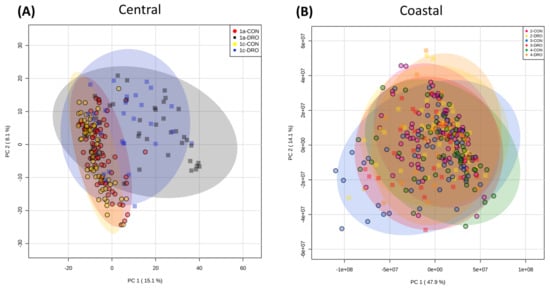 The metabolomes of Brachypodium central and coastal accessions under drought stress and in controls. Eight- week-old Brachypodium accessions were transferred to the National Plant Phenomics Centre, Aberystwyth, UK. The watering was regulated to soil water contents (SWC) of 15% (droughted, DRO), 40% and 75% (controls, CON). After 12 days of drought, leaves were sampled and the metabolomes were assessed using FIE-HRMS. Principal component analysis of Brachypodium accessions within the (A) central (Turkish climatic regions 1a, 1c) and (B) coastal (Turkish climatic regions 2, 3, 4) subpopulations [].