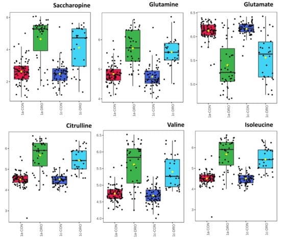 Amino acid changes seen in the central subpopulations in response to drought. Eight-week-old Brachypodium accessions were transferred to the National Plant Phenomics Centre, Aberystwyth, UK. The watering was regulated to soil water contents (SWC) of 15% (droughted, DRO), 40% and 75% (controls, CON). After 12 days of drought, leaves were sampled and the metabolomes were assessed using FIE-HRMS. Key variables changing in Brachypodium accessions within the central subpopulation (Turkish climatic regions 1a, 1c) [] with drought and related to amino acid are displayed using box and whisker plots.