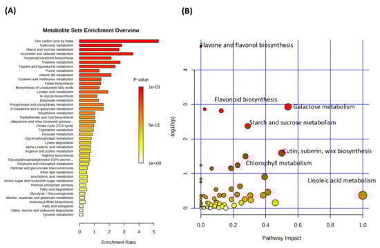 To reduce the influence of background genotypic metabolomic differences we considered variation in central and coastal subpopulations separately (Figure 5A,B). PCA of the central subpopulation showed that many accessions showed a response to drought (Figure 5A). In contrast, no clear response to drought was seen in the coastal accessions (Figure 5B). The source of variation in the central drought response were identified and ranked according to p value (Figure 6). This suggested that when considering individual metabolite changes there were changes in a range of amino acids (glutamate, glutamine, citrulline, leucine and valine) and saccharopine. To consider more wide-ranging differences, pathway enrichment (Figure 7A) and pathway impact analyses (Figure 7B) were undertaken based on the significant metabolite. These suggested statistically significant (Holm p < 0.05, FDR < 0.05) changes in galactose metabolism, pentose phosphate pathway and glycolysis/gluconeogenesis (Supplementary Materials Table S4). Therefore, changes in sugar and bioenergetic metabolism were prominent in the responses for the central subpopulation to drought.