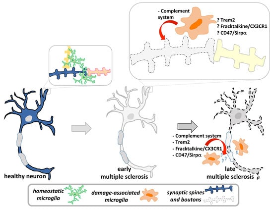 In response to MS-induced inflammatory stimuli, microglia significantly affect the structure and function of synapses through different mechanisms. One such mechanism is the release of cytokines, known to modulate neuronal activity and synaptic plasticity in both physiologic and pathologic conditions [], as extensively reviewed by other groups [,,], the discussion of which is outside the scope of the present review.