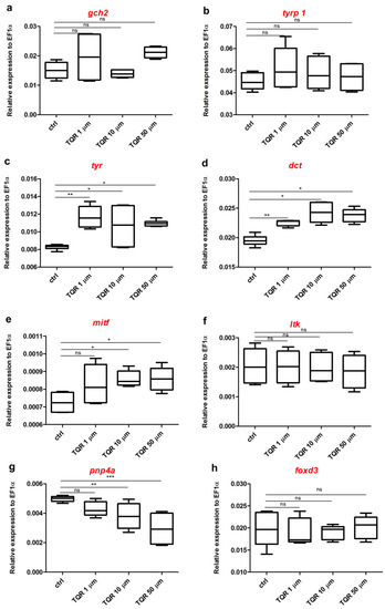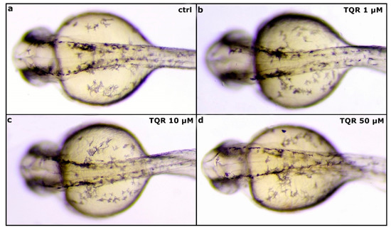 The effects of the exposure to 1 µM, 10 µM, and 50 µM TQR (lasted from 4 hpf until 56 hpf) on the mRNA level of various genes encoding chromatophore differentiation markers were determined by RT-qPCR (Figure 6). The analysis clearly showed that each dose of TQR had no statistically significant influence on tyrp and gch2 and foxd3 (p > 0.05) (Figure 6a,b,h). Tyr and dct were upregulated after the exposure to all studied TQR concentrations, however, not in an evident dose-dependent manner (p < 0.05–0.01) (Figure 6c,d). Mitf was not altered by 1 µM TQR (p > 0.05) (Figure 6e); however, after the treatment with higher TQR doses, a significant increase in mRNA expression level was found (p < 0.05) (Figure 6e). The mRNA level of pnp4a was reduced after the treatment with all studied TQR exposure doses in a dose-dependent manner (p < 0.01) (Figure 6g).