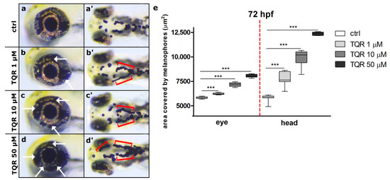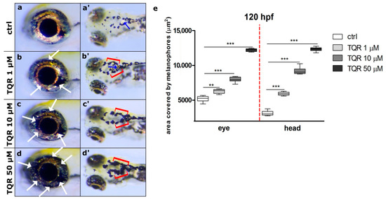 To demonstrate the properties of TQR as a melanogenic enhancer, first, 4 hpf embryos were exposed to three different TQR concentrations: 1 µM, 10 µM, and 50 µM. To establish the effects of TQR exposure during embryogenesis two distinct regions were chosen—the eye and dorsal head. During the first 48 h of development, no significant changes in the morphology and area covered by melanophores were observed between control and TQR-exposed groups (Figure 1). However, from 72 hpf, we observed progress, i.e., a dose-dependent increase in the area covered by melanophores (Figure 2). At 72 hpf, in the control group, the average area covered with melanophores within the dorsal head was 5820.7 ± 330.94 µm2 (Figure 2a’,e) and within the eye was 5829.5 ± 103.77 µm2 (Figure 2a,e). Exposure to 1 µM resulted in 1.4-fold increase in the area covered by melanophores within the dorsal head (8487.5 ± 456.0 µm2) (p < 0.001) (Figure 2b’,e) and 1.15-fold increase within the eye (6752.2 ± 139.20 µm2) (p < 0.001) (Figure 2b,e). In 10 µM-exposed group, we found 1.8-fold increase within the dorsal head (10,397.7 ± 425.41 µm2) (p < 0.001) (Figure 2c’,e) and 1.2-fold increase within the eye (7210.5 ± 210.42 µm2) (p < 0.001) (Figure 2c,e). The 50 µM exposure resulted in the highest increases at the level of 2.1-fold within the dorsal head (1236.7 ± 168.23 µm2) (p < 0.001) (Figure 2d,e) and 1.4-fold within the eye (8062.1 ± 150.28 µm2) (p < 0.001) (Figure 2d,e) compared to the control group. At 120 hpf, the dose-dependent trend persisted; however, the stimulatory melanogenic effect intensified in comparison to the results obtained at 72 hpf (Figure 3). In the control group, the average area covered with melanophores within the dorsal head was 3136.2 ± 342.21 m2 (Figure 3a’,e) and within the eye was 5168.2 ± 405.48 µm2 (Figure 3a,e). Within the dorsal head the exposure to 1 µM, 10 µM, and 50 µM resulted in, respectively, 1.9 (5921.9 ± 246.64 µm2) (p < 0.001) (Figure 3b’,e), 2.9 (9229.9 ± 554.44 µm2) (p < 0.001) (Figure 3c’,e) and 3.9 (12,331.1 ± 298.25 µm2) (p < 0.001) (Figure 3d’,e) fold increases in the area covered by melanophores compared to the control group. Within the eye the changes were slightly lower and represented 1.2 (6292.0 ± 285.31 µm2) (p < 0.01) (Figure 3b,e), 1.5 (7943.5 ± 345.70 µm2) (p < 0.001) (Figure 3c,e) and 2.3 (12,213.5 ± 199.22 µm2) (p < 0.001) (Figure 3d,e) fold increases in the respective concentrations of 1 µM, 10 µM, and 50 µM TQR. Moreover, especially within the dorsal head region, altered melanophore morphology was observed. They became expanded and formed closely apposed groups.