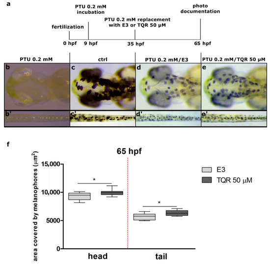 To confirm the stimulatory effect of TQR during melanogenesis, one more experiment was carried out. Firstly, 9 hpf embryos were exposed to 0.2 mM PTU to achieve no pigmented phenotype. After that, at 35 hpf, the PTU solution was replaced by E3 or 50 µM TQR, and the effects of this replacement were observed at 65 hpf. The results obtained showed that in the group in which PTU was replaced with 50 µM TQR the area covered with melanophores was moderately larger than in the group in which PTU was replaced with E3 (Figure 4). To determine the effects of TQR exposure after PTU treatment, two distinct regions were chosen—the tail and dorsal head. At 35 hpf, all embryos demonstrated transparent phenotype—neither melanophores nor iridophores were visible around the body. Moreover, 30 h after PTU replacement in the E3-exposed group, the average area covered with melanophores within the dorsal head was at the level of 9264.4 ± 694.0 µm2 (Figure 4d,f) and within tail was at the level of 5696.4 ± 546.76 µm2 (Figure 4d’,f). Replacement with 50 µM TQR resulted in slightly swifter melanophore renewal. In this group, the average area covered with melanophores within the dorsal head was at the level of 9942.0 ± 552.82 µm2 (p < 0.05) (Figure 4e,f) and within the tail was at the level of 6350.8 ± 470.75 µm2 (p < 0.05) (Figure 4e’,f).