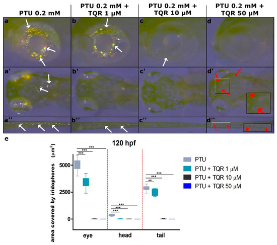 To demonstrate the properties of TQR as an iridophore development silencer, 9 hpf embryos were exposed to three different TQR concentrations: 1 µM, 10 µM, and 50 µM, but each dose was additionally mixed with 0.2 mM PTU. This procedure was applied to assess the direct influence on iridophores excluding interferences with melanophores. This issue is more widely described in the Discussion Section. We observed that PTU treatment affects only melanophores, but not iridophore development. At 120 hpf in the PTU-exposed group, the average area covered with iridophores was respectively as follows: within the eye 5014.7 ± 551.16 µm2, within the dorsal head 359.2 ± 86.64 µm2, and within the tail 2856.7 ± 247.33 µm2 (Figure 5a,a’,a”,e). The addition of 1 µM TQR to the treatment solution resulted in a moderate reduction in the size of the area covered with iridophores. We found 1.5-fold decrease within the eye (3382.8 ± 524.13 µm2) (p < 0.01) (Figure 5b,e), 40-fold decrease within the dorsal head (9.2 ± 16.32 µm2) (p < 0.001) (Figure 5b’,e), and 1.15-fold decrease within the tail (2502.2 ± 290.08 µm2) (p < 0.01) (Figure 5b”,e). After the addition of 10 µM TQR to the treatment solution, we reported nearly complete extinction of the iridophores population. In most cases, the iridophores were undetectable, while in some individuals we observed the solitary cells, which covered the studied areas at the average level of 8.7 ± 12.45 µm2 within the eye (p < 0.001) (Figure 5c,e), 3.7 ± 6.49 µm2 within the dorsal head (p < 0.001) (Figure 5c’,e), and 8.8 ± 16.91 µm2 within the tail (p < 0.001) (Figure 5c”,e). In turn, the inclusion of 50 µM TQR to the treatment solution resulted in complete depletion of iridophores from all investigated areas (p < 0.001) (Figure 5d,d’,d”,e). However, we observed that in the 0.2 mM PTU + 50 µM TQR-exposed group, some melanophores began to appear (Figure 5d’,d”).