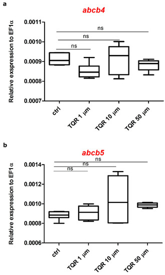 The effects of the exposure to 1 µM, 10 µM, and 50 µM TQR (lasted from 4 hpf until 56 hpf) on the mRNA level of genes encoding Abcb4 and Abcb5 were determined by RT-qPCR (Figure 7). The expression of abcb4 was not statistically significantly altered after the treatment with all studied TQR concentrations (p > 0.05) (Figure 7a). The analysis of the expression of abcb5 gene revealed a slight but not statistically significant dose-dependent increase (p > 0.05) (Figure 7b).