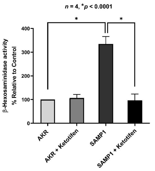 Effect of ketotifen on β-hexosaminidase activity in small intestinal villus cells. β-hexosaminidase activity was significantly increased in intestinal villus cells isolated from the chronically inflamed SAMP1 mice when compared to AKR control mice. In vivo treatment with ketotifen in SAMP1 mice restored β-hexosaminidase activity at normal levels while having no effect in the ketotifen treated AKR mice.