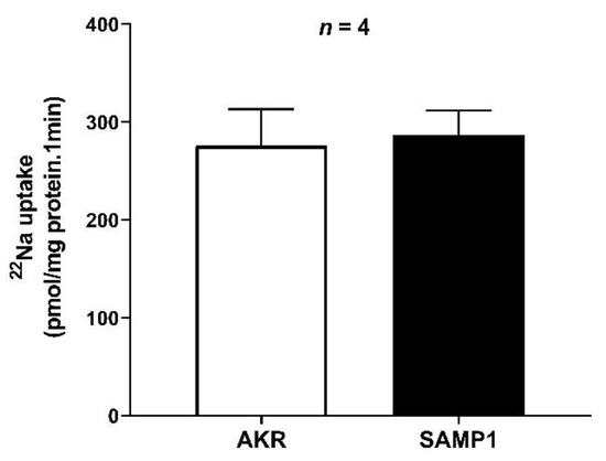 Na/H exchanger (NHE3) activity in ileal villus cells BBMV. pH dependent and amiloride sensitive 22Na uptake was measured as NHE3 activity, which remained unchanged in BBMVs of intestinal villus cells from SAMP1 mice compared with AKR control mice.