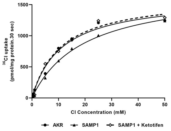 Kinetics of Cl−/HCO3− exchange in intact intestinal villus cells from AKR, SAMP1 and ketotifen treated SAMP1 mice. HCO3−-dependent and DIDS-sensitive 36Cl uptake is shown as a function of varying concentrations of extra vesicular Cl− at 30 s. As the concentration of extra-vesicular Cl− was increased, 36Cl uptake was stimulated and subsequently became saturated in all conditions. Analysis of the data yielded kinetic parameters. In villus cells isolated from SAMP1 mice the Cl−/HCO3− exchange was inhibited by altering the affinity of the transporter for Cl− and ketotifen treatment significantly reversed the inhibited Cl−/HCO3− exchange in SAMP1 villus cell by restoring the affinity of the transporter (Km) without an alteration in the maximal rate of uptake (Vmax) of Cl.