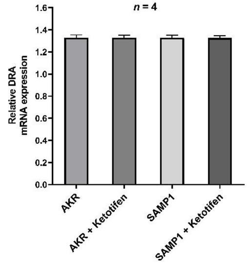 RT-qPCR analysis of DRA mRNA expression in intestinal villus cells isolated from ketotifen treated and untreated AKR, and SAMP1 mice. DRA mRNA expression remained unchanged in all experimental samples. The data obtained with β-actin was used to normalize the expression levels of DRA between individual samples.