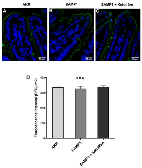 In order to localize DRA in the mice ileum and to further confirm if it is affected by chronic intestinal inflammation in SAMP1 mice, immunofluorescence was performed along with AKR control mice. Figure 8 demonstrates that DRA is present in the BBM of mice small intestinal villus cells. Further, DRA protein expression was unaltered during chronic intestinal inflammation in SAMP1 mice compared to that of AKR mice. In SAMP1 mice treated with ketotifen DRA protein expression also remained unchanged. Altogether, immunofluorescence results along with molecular studies and kinetic parameters demonstrate that Cl−/HCO3− exchange inhibition during chronic inflammation is not secondary to a decrease in protein expression.