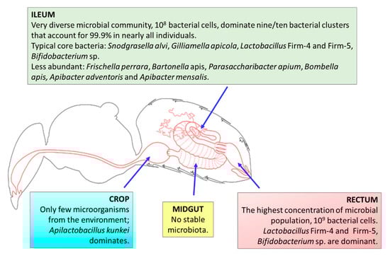 Using 16S rDNA community surveys and metagenomics of the total DNA, it was determined that guts of worker honeybees are inhabited by nine bacterial species clusters that account for 95–99.9% of the bacteria in almost all individuals [59,62,63]. Two ubiquitous Gram-negative species—Snodgrasella alvi (nonfermenting sugar bacteria that form a film directly on the gut wall; family Neisseriaceae) and Gilliamella apicola (bacteria with the ability to ferment sugar that inhabits areas directed toward the center of the lumen; family Orbaceae)—that are members of the Proteobacteria phylum can be distinguished [2,59,63]. There are two Gram-positive species belonging to phylum Firmicutes that are ubiquitous and abundant; namely, Lactobacillus Firm-4 and Lactobacillus Firm-5, which inhabit the distal rectum [2,59]. In the majority of adult workers, Bifidobacterium asteroides is also found (albeit with much lower abundance) [53,61]. The mentioned bacterial species clusters are the most essential microorganisms in the honeybee gut, the so-called “core bacteria” [64]. There are also less-abundant/stable species from Proteobacteria: The Gammaproteobacteria Frischella perrara (Orbaceae family); the Alphaproteobacteria Parasaccharibacter apium, Bombella favorum, Bombella mellum, Bombella apis (Acetobacteraceae family, Alpha 2.2); and Commensalibacter sp. (Alpha 2.1) and Bartonella apis (Alpha 1) from the Rhizobiaceae family [50,53,59,63,65,66]. Representatives of phylum Bacteroidetes have also been identified in the honeybee gut—Apibacter adventoris and Apibacter mensalis [67,68].