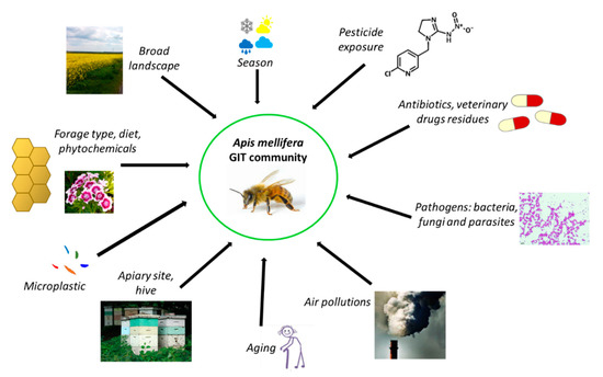 Interactions between the honeybee gut community and the environment are complex and not well understood. There exists a huge diversity of gut microorganisms among insects, influenced by many factors such as habitat, feeding preference, life stage, and host species. Jones et al. [59] showed that the broad landscape influenced the diversity of some members of honeybee gastrointestinal microbiota, especially those belonging to Proteobacteria and Firmicutes. Muñoz-Colmenero et al. [102] demonstrated that the environment plays the main role in determining honeybee microbiota, and that agricultural treatments cause disruption to the bacterial community.
