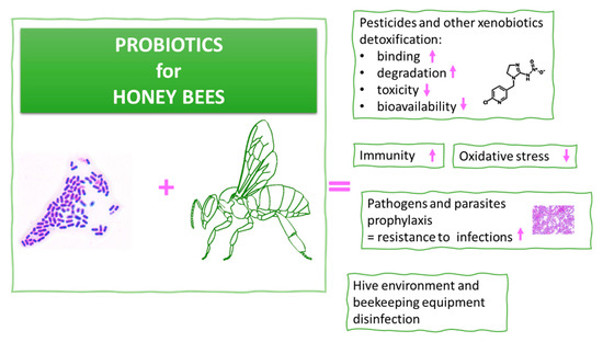Due to their beneficial health effects, some LAB are considered probiotics. Probiotics are defined as live microorganisms that, if administered in adequate amounts, confer a health benefit on the host [200]. In order to identify the microorganism as a probiotic, it should fulfill a set of conditions [201]. Therefore, considering the fact that some LAB are probiotic, they are nonpathogenic, nontoxic, and achieve GRAS (Generally Recognized as Safe) status. They remain alive and active in GIT, are highly resistant to digestive enzymes and stomach acid, and have the ability to adhere to the intestinal epithelium [201,202]. Additionally, for a probiotic strain to possess the status “probiotic”, it should distinguish itself with a special feature characteristic of all LAB. For example, in the case of probiotics for honeybees, this could include immune-system stimulation; pathogen inhibition; or pesticide/xenobiotic degradation, binding, or neutralization. The supplementation of honeybees with probiotic LAB is a promising concept that could mitigate the harmful effects of pathogens and pesticides. However, there is no information regarding the molecular mechanisms of probiotics in protecting honeybees against pathogens. From the literature, data show that LAB are most effective in pesticide degradation during fermentation, which takes place in the GIT of honeybees. The protective effects of probiotics toward toxicity (cyto- and genotoxicity) of pesticides, especially neonicotinoid, have not been investigated comprehensively. A short review of LAB and pesticide interactions is presented in Table 1. The organophosphorus insecticide chlorpyrifos seems to be one of the most widely studied pesticides in relation to LAB. These studies indicate that the application of LAB in pesticide detoxification/removal is a safe and highly efficient method, both from the culture medium as well as during the fermentation of the contaminated food. Binding or biosorption is preferred to degradation, as the latter can generate toxic metabolites [203].
