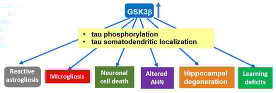 Tau deficiency in mice leads to impairment in the maturation of newborn granule neurons under basal conditions and these neurons are unresponsive to stimuli that modulate AHN, such as environmental enrichment []. Tau also underlies the effects of stress on AHN in mouse brain [,]. During the pathogenesis of AD and other tau-related dementia, changes in soluble tau species, including tau phosphorylation, lead to neuronal death []. Notably, soluble tau, mostly composed of monomers and dimers, induces long-term detrimental effects on the morphology and connectivity of newborn granule neurons, in correlation with impaired behavioral pattern separation skills []. Overall, these data suggest that at least part of the observed effects of GSK-3β in AHN might be mediated by its target protein tau (see Figure 3).