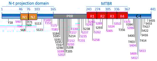 Tau is a microtubule (MT)-associated protein [,], mainly expressed in neurons []. Tau binds along the MT lattice and regulates MT assembly, stability, and dynamics in neurons (reviewed in []). Recent work suggests that tau preferentially binds GDP-tubulin at the MT polymer [] and that tau enables axonal MTs to have long labile domains [,]. Tau protein shows different functional domains []. The longest tau isoform (tau 2N4R, 441aa, Figure 2) contains an N-terminal projection domain with two inserts (N1 and N2), a proline-rich region (PRR), a MT binding region (MTBR), and a C-terminal domain. The MTBR is formed by three or four imperfect repeat sequences: R1, R2, R3, and R4 (Figure 2) [].
