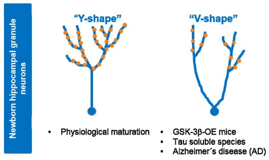 GSK-3β has emerged as one of the key regulators of AHN. Voluntary exercise in mice has been shown to induce an increase in AHN and improved cognition in correlation with activation of GSK-3β []. Other reports indicate that inhibition of GSK-3β promote AHN in vitro and in vivo [,]. Cerebral ischemia-induced AHN involves GSK-3β inactivation downstream of the PI3-K/Akt pathway []. Dysregulated hyperactive GSK-3 impairs in vivo neurogenesis in mice and the capacity of therapeutic agents to stimulate neurogenesis []. Of note, conditional overexpression of GSK-3β in mice (Tet/GSK3β mice) leads to a number of defects in AHN, such as non-reversible depletion in neurogenic niches in the dentate gyrus of hippocampus, impairment in the differentiation and maturation of newborn neurons, delay in the switching-off of doublecortin expression, as well as alteration in the survival and death rates of immature precursors []. Interestingly, GSK-3β overexpression in mice (Tet/GSK3β mice) causes reversible alterations to the dendritic morphology and postsynaptic densities of hippocampal granule neurons, similar to the morphological defects found in hippocampal neurons of AD patients [] (see Figure 3). In line with this, GSK-3 inhibitors have been shown to improve the cognitive function in mouse models of different diseases such as AD, Down syndrome (DS), or Fragile X syndrome, by partially repairing defects in neurogenesis that occur in these disorders []. Tau has been shown to play key in vivo roles in the morphological and synaptic maturation of newborn hippocampal granule neurons in mice [].