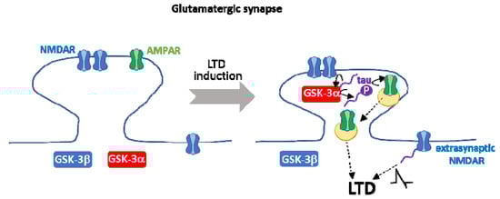 Remarkably, GSK-3α specific implication in LTD occurs via its transient anchoring in dendritic spines in a tau-dependent manner []. GSK-3α overexpression leads to LTD only in the presence of tau, suggesting that tau is downstream of GSK-3α in this process []. GSK-3 phosphorylates tau during LTD [], and phosphorylation of tau in a GSK-3 site (Ser 396) is essential for LTD []. Therefore, GSK-3-mediated tau phosphorylation and GSK-3α accumulation in dendritic spines may be crucial events to trigger LTD. Tau actions on AMPAR internalization and on NMDA extrasynaptic currents contribute further to LTD, as mentioned above. The interplay between GSK-3α and tau during NMDAR-mediated LTD is complex and requires further investigation (see Figure 4).