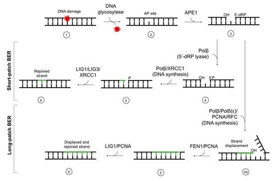 The scheme of short-patch and long-patch base excision repair (BER). The main stages of the repair are (1) damage recognition by DNA glycosylases, (2) excision of the damaged base and AP site formation, (3) strand incision, (4) end processing, (4a) end processing and strand displacement, (5) DNA synthesis (gap-filling), and (6) ligation. AP site—apurinic/apyrimidinic site; APE1—AP endonuclease 1; Polβ,δ,ε—polymerases β, δ, ε; XRCC1—X-ray repair cross-complementing protein 1; FEN1—flap structure-specific endonuclease 1; PCNA—proliferating cell nuclear antigen; RFC—replication factor C; LIG1—ligase I; LIG3—ligase III.