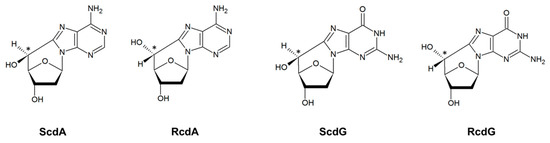 The ScdA is one of the most studied cdPu in the context of clustered DNA damage [12,20,25,32,37,38,39]. The RcdA is present in DNA in lower quantities than ScdA [21]. Interestingly, sunlight causes irreversible photoisomerization of ScdA to RcdA [40].