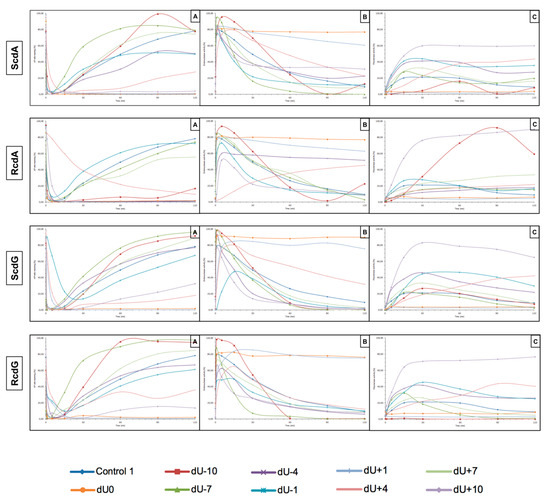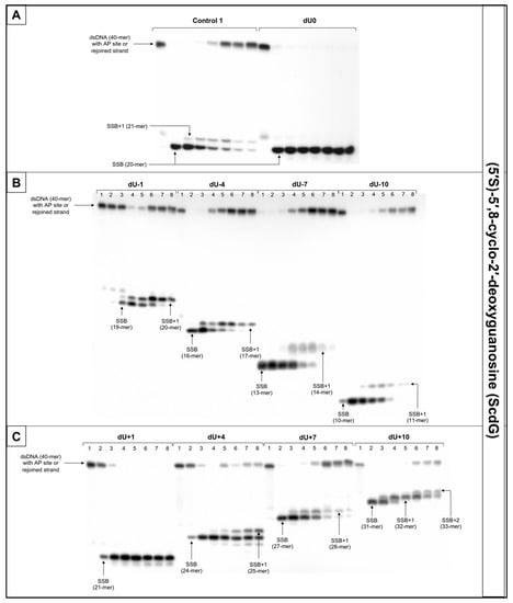 The representative autoradiograms of denaturing PAGE presenting repair of dsDNA containing clustered damage with AP site in one strand and ScdG in the opposing strand: (A) Controls: dsDNA with a single lesion in one strand (Control 1); dsDNA with clustered lesions in two strands opposite to each other (dU0); (B) dsDNA with clustered lesions in two strands where AP site is located 1–10 base pairs in 3′ direction (negative numbers); (C) dsDNA with clustered lesions in two strands where AP site is located 1–10 base pairs in 5′ direction (positive numbers). Each lane corresponds with different assay time: lane 1–0 min; lane 2–1 min; lane 3–5 min; lane 4–15 min; lane 5–30 min; lane 6–60 min; lane 7–90 min; lane 8–120 min. Each experiment was performed in triplicate to ensure results’ consistency.