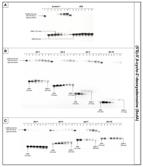 The representative autoradiograms of denaturing PAGE presenting repair of dsDNA containing clustered damage with AP site in one strand and ScdA in the opposing strand: (A) Controls: dsDNA with a single lesion in one strand (Control 1); dsDNA with clustered lesions in two strands opposite to each other (dU0); (B) dsDNA with clustered lesions in two strands where AP site is located 1–10 base pairs in 3′ direction (negative numbers); (C) dsDNA with clustered lesions in two strands where AP site is located 1–10 base pairs in 5′ direction (positive numbers). Each lane corresponds with different assay time: lane 1–0 min; lane 2–1 min; lane 3–5 min; lane 4–15 min; lane 5–30 min; lane 6–60 min; lane 7–90 min; lane 8–120 min. Each experiment was performed in triplicate to ensure results’ consistency.