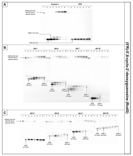 The representative autoradiograms of denaturing PAGE presenting repair of dsDNA containing clustered damage with AP site in one strand and RcdG in the opposing strand: (A) Controls: dsDNA with a single lesion in one strand (Control 1); dsDNA with clustered lesions in two strands opposite to each other (dU0); (B) dsDNA with clustered lesions in two strands where AP site is located 1–10 base pairs in 3′ direction (negative numbers); (C) dsDNA with clustered lesions in two strands where AP site is located 1–10 base pairs in 5′ direction (positive numbers). Each lane corresponds with different assay time: lane 1–0 min; lane 2–1 min; lane 3–5 min; lane 4–15 min; lane 5–30 min; lane 6–60 min; lane 7–90 min; lane 8–120 min. Each experiment was performed in triplicate to ensure results’ consistency.