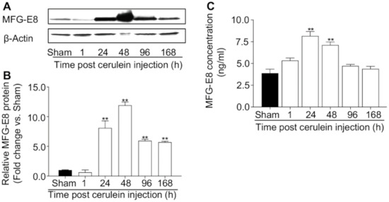 Repeated administration of cerulein induces self-limited acute pancreatitis in mice [23,24,25,26,27], with a natural course divided into an acute phase (up to 24 h after the first injection) and a recovery phase (2 to 7 days after the first injection) [27]. Utilizing this model, we examined MFG-E8 expression during both the acute and recovery phases by immunoblot. MFG-E8 was constitutively expressed in mouse pancreas. Its expression increased in the late acute phase (24 h), reached its peak 48 h after cerulein challenge, and declined during the recovery phase but remained at a higher level compared to sham-controls (Figure 1A,B).