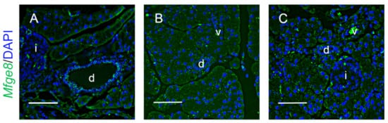 Formalin-fixed and paraffin-embedded tissue sections (5-µm thickness) were used with the RNAscope Fluorescent Reagent Kit v2 and an RNAscope probe for mouse Mfge8 mRNA (Cat# 408771, Advanced Cell Diagnostics, Newark, CA, USA). A standard protocol used by our laboratory [29] for RNAscope fluorescent in situ hybridization was followed. After staining, slides were mounted with the antifade mounting media containing 4′, 6-diamidino-2-phenylindole (DAPI, H-1500, Vector Laboratories, Burlingame, CA, USA) and images were acquired using THUNDER Imaging Systems (Leica Microsystems, Wetzlar, Germany). Images were processed with Adobe Photoshop software (CC 2020).