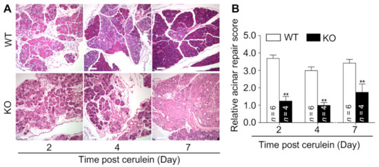 Previous studies showed that cerulein-induced acute pancreatitis is transient and self-limited in mice [31,32]. Because MFG-E8 levels remained high during the recovery phase of cerulein-induced acute pancreatitis (Figure 1), we examined whether lack of MFG-E8 impacts pancreatic recovery. WT and Mfge8 KO mice were injected with cerulein as described above and the pancreas was collected at 2, 4, and 7 days after the first injection. Two days after the onset of pancreatitis, the WT mouse pancreas exhibited typical features of prominent histological stromal reaction. Profound acinar regeneration was observed at 4 days and restoration of pancreatic architecture was evident at 7 days (Figure 4A,B, and Supplementary Figure S2). In Mfge8 KO mice, the stromal response began at 2 days and was prolonged for 7 days after the initial cerulein injection (Figure 4A,B and Supplementary Figure S2). Only mild acinar regeneration was observed throughout the course of cerulein-induced pancreatitis in Mfge8 KO mice. Collectively, these findings demonstrate that MFG-E8 plays an important role in promoting acinar repair.