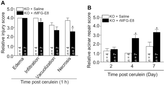 3.3. Mice Lacking MFG-E8 Show Delayed Recovery from Cerulein-Induced Acute Pancreatitis