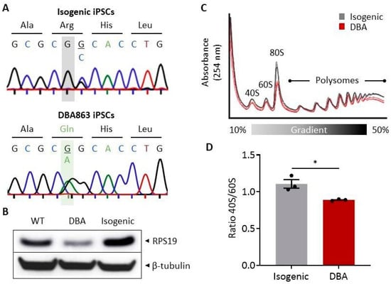 Generation and characterization of isogenic and DBA iPSCs. (A) Genomic RPS19 sequence trace chromatograms for isogenic (top panel) and DBA863 (bottom panel) iPSCs to confirm CRISPR/Cas9-mediated correction (grey highlight) of heterozygous c.185G>A (pR62Q) nonsense mutation (green highlight). In isogenic iPSCs, the overlapping G/C bases represent a silent mutation introduced in the template DNA during genome editing to complete an AscI restriction site (GGCGCGCC) for rapid RFLP screening of RPS19 gene corrected iPSC clones. (B) Western blot for RPS19 and β-tubulin loading control for wild-type (WT), DBA and isogenic iPSCs. (C) Sucrose gradient (10–50%) polysome profiling analyses for isogenic and DBA iPSCs. Peaks represent ribosomal subunits (40S and 60S), 80S monosomes, and ribosome clusters (polysomes). (D) Calculated 40S/60S ratios for isogenic and DBA iPSCs. Data are presented as mean ± standard error of the mean (SEM). Unpaired t-test, * p ≤ 0.05 (n = 3).
