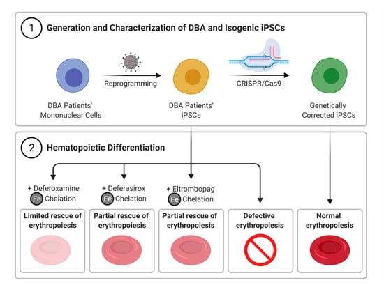 Summary. iPSC lines were generated from blood cells of DBA patients, and isogenic iPSC clones were produced by CRISPR-mediated correction of RPS19 mutations. Hematopoietic differentiation of DBA iPSCs phenocopied the erythroid maturation defect found in DBA. Defective erythropoiesis was partially rescued by eltrombopag and deferasirox, but did not improve substantially with deferoxamine, consistent with a mechanism based on intracellular iron chelation.