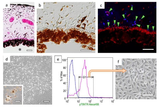 p75NTR-positive cells observed in human iris tissue and cultured cells: (a) HE-stained human iris tissue; * The lens side of the iris. (b) Differential interference contrast image of iris tissue. (c) Fluorescent immunostaining of p75NTR; arrowheads = p75NTR-positive cells. (d) Iris-derived cells were cultured for 10 days; the inset shows cells growing from around the pigmented cells on the third day of culture. (e) p75NTR-positive cells (region of Gate 1, G1) were isolated with a cell sorter; the blue line represents the histogram of negative cells. (f) Morphology of p75NTR-positive sorted cells. Bars in panels (a–c), 50 μm; bars in panel (d)’s inset and panel (f), 100 μm; bar in panel (d), 200 μm.
