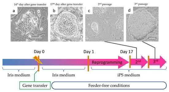 Iris tissue stem/progenitor cells were reprogrammed using the Epi5™ Episomal iPSC Reprogramming Kit cited above, by a micro-electroporation method. The reprogramming protocol is illustrated in Figure 2. From around the 14th day of reprogramming, colonies with densely aggregated, proliferating cells were observed (Figure 2a). On the 17th of reprogramming, we peeled the cells off in order to surround the colony, and we replaced the cells (Figure 2b). In the second passage, a denser cell clump was observed (Figure 2c). As the passages continued, an aggregation of large iPS cells showing a colony-like morphology was observed (Figure 2d).